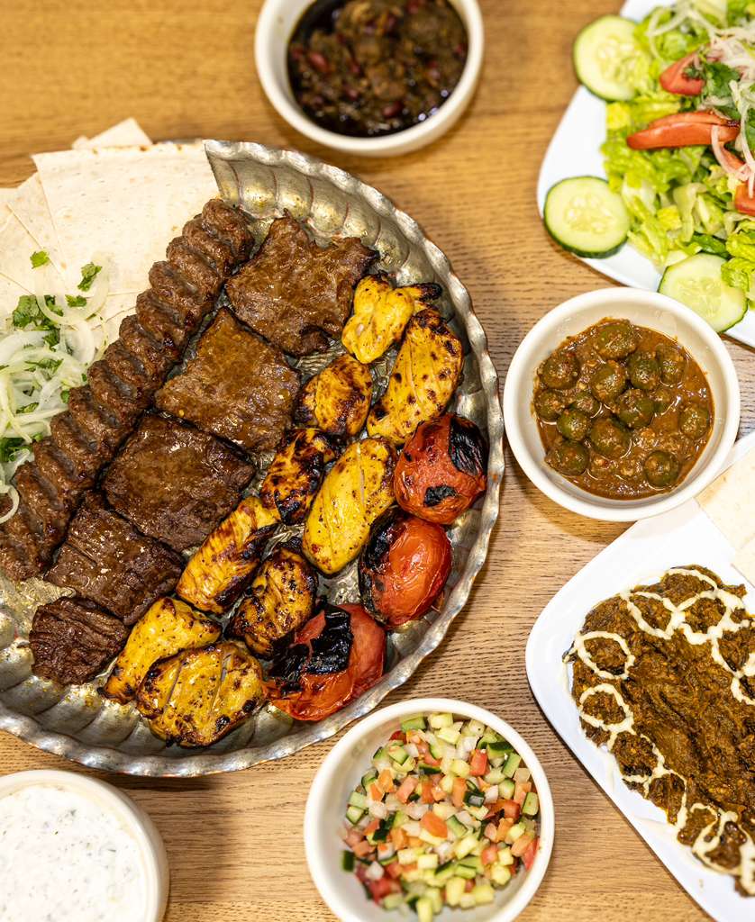 One Skewer Of Chicken Breast, One Skewer Of Chicken Thigh , One Skewer Of Ground Beef Kabob ( Koobideh) , Served With Two Portions Of Basmati Rice & Grilled Tomatoes