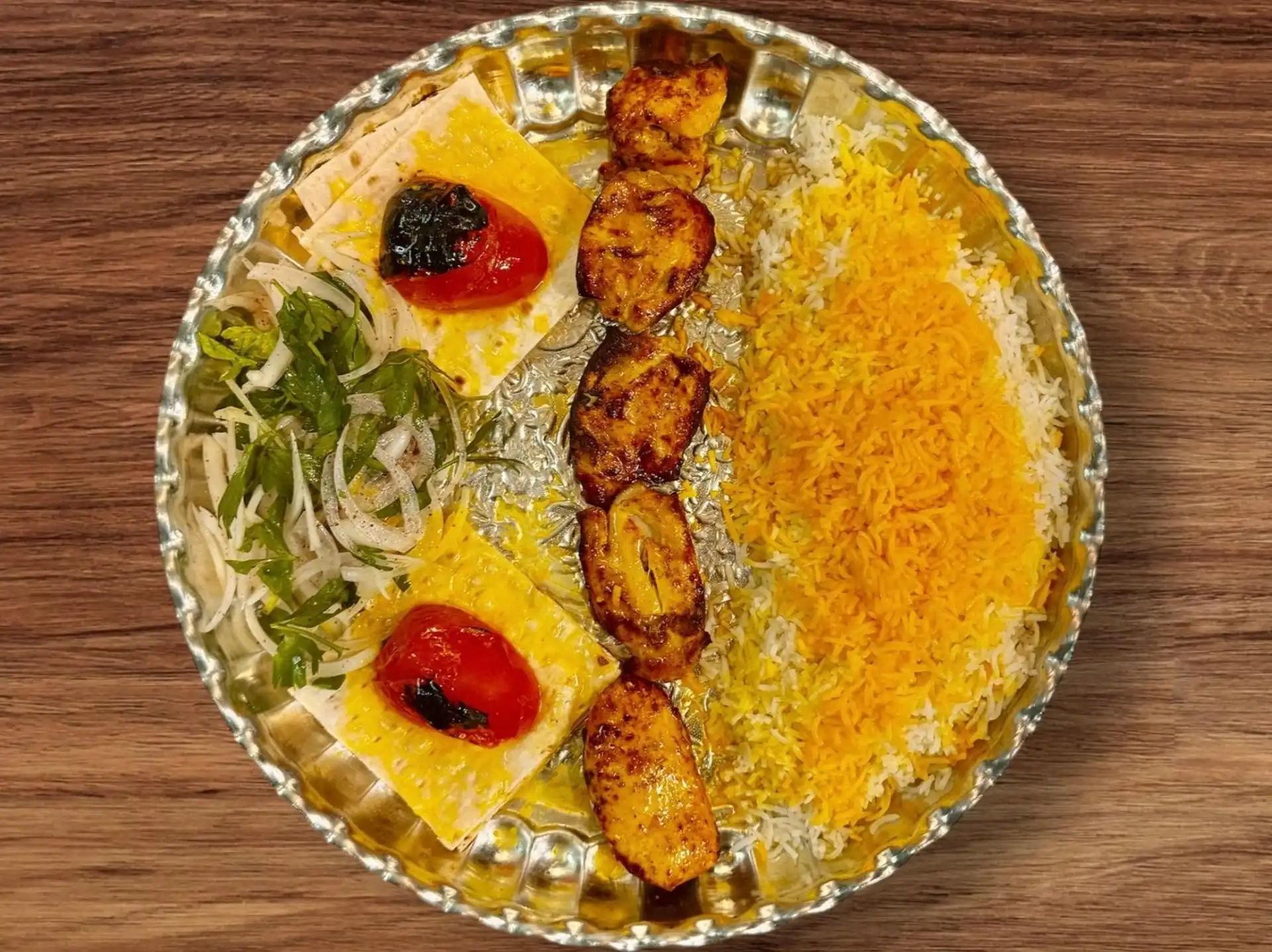 One Skewer Of Chicken Breast , One Skewer of Ground Beef Kabob ( Koobideh) served With Basmati Rice & Grilled Tomato