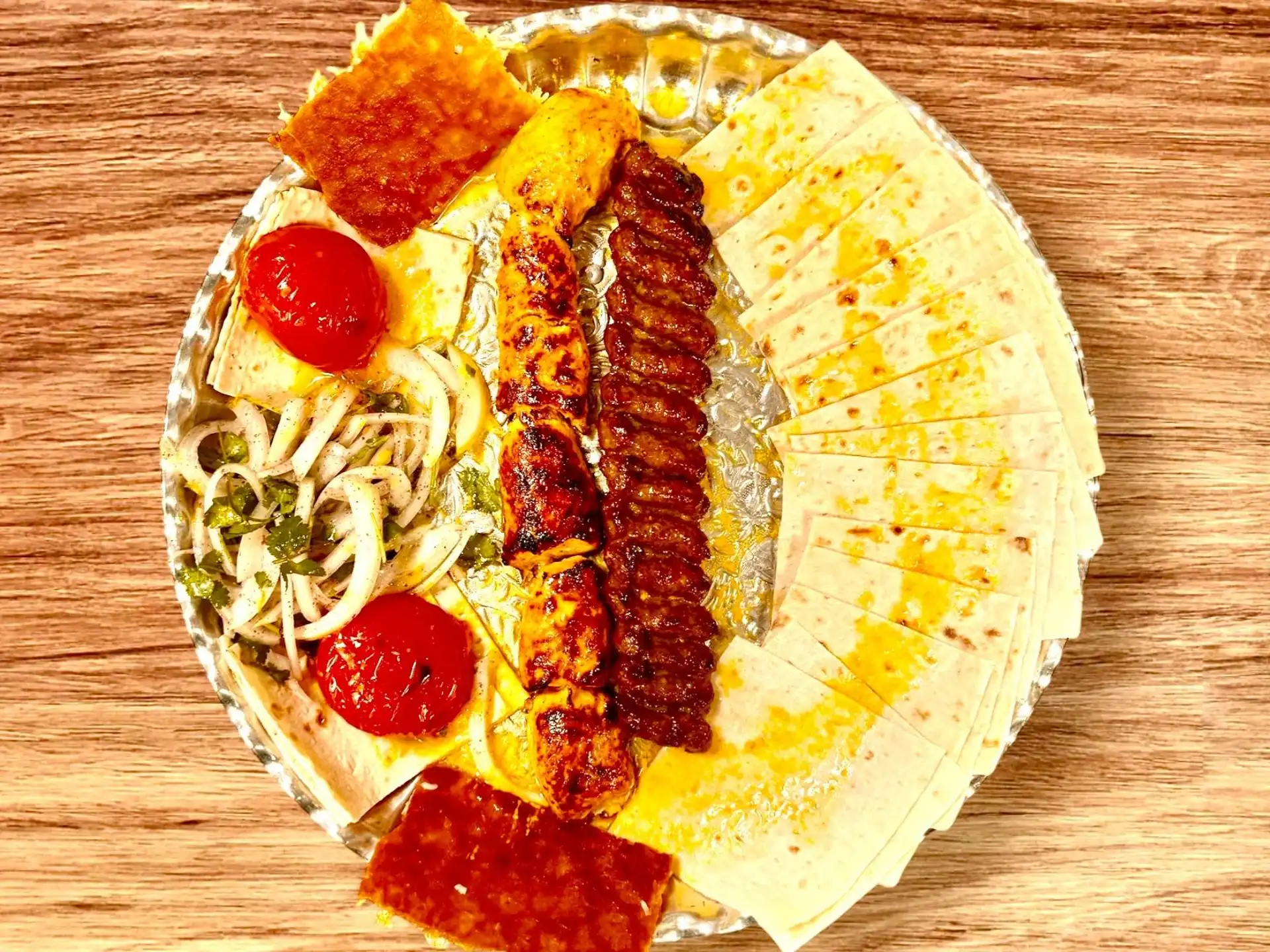 One Skewer Of Chicken Breast , One Skewer Of Ground Beef Kabob ( Koobideh) Served With Lavash Bread & Grilled Tomato