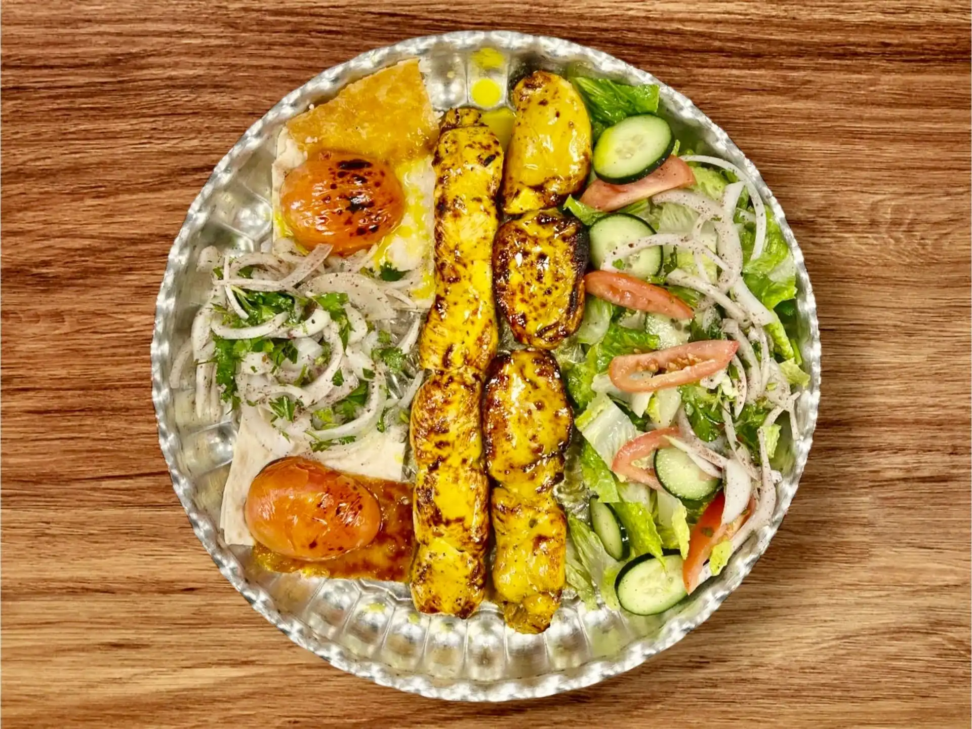 One Skewer Of Chicken Breast , One Skewer Of Ground Beef Kabob (Koobideh) Served With Salad & Grilled Tomato