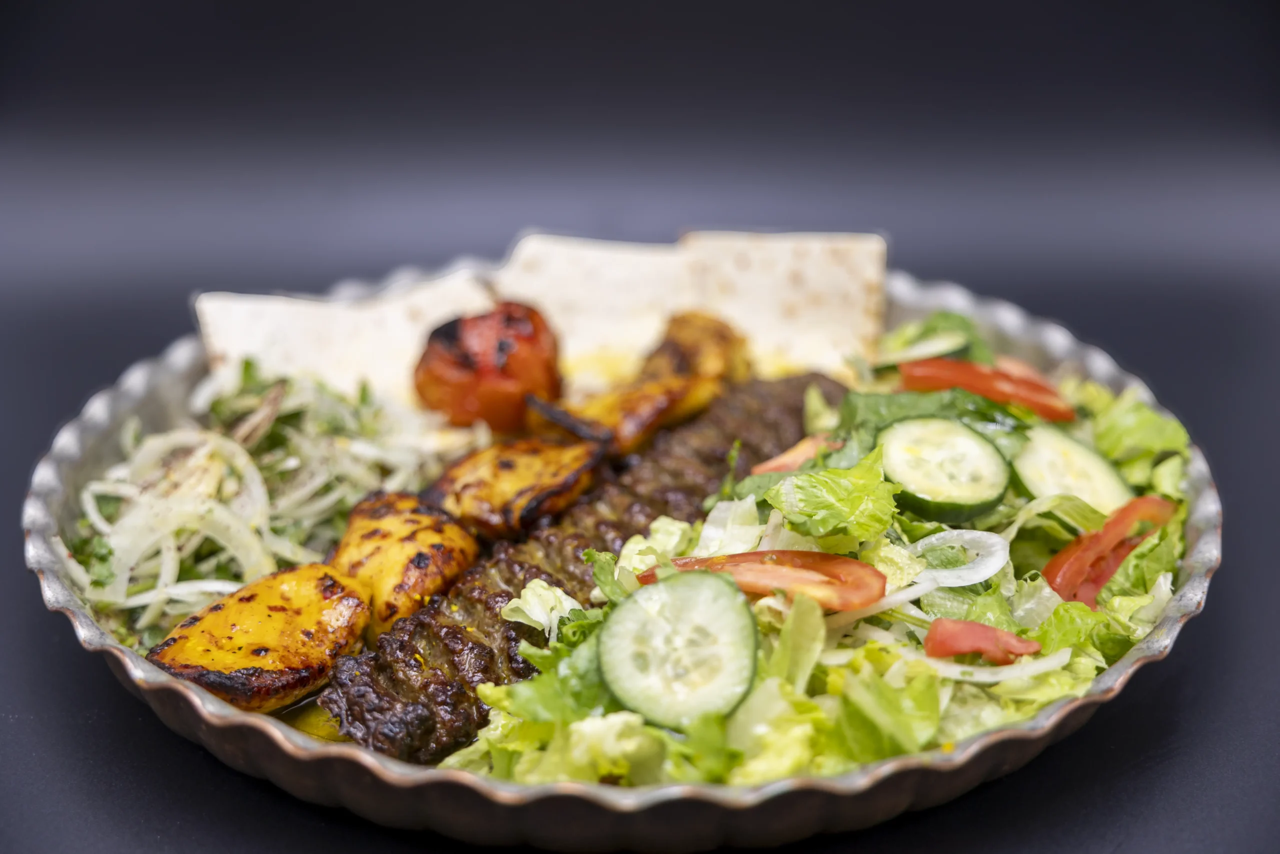 One Skewer Of Chicken Thigh , One Skewer Of Ground Beef ( Koobideh) Served With Salad & Grilled Tomato