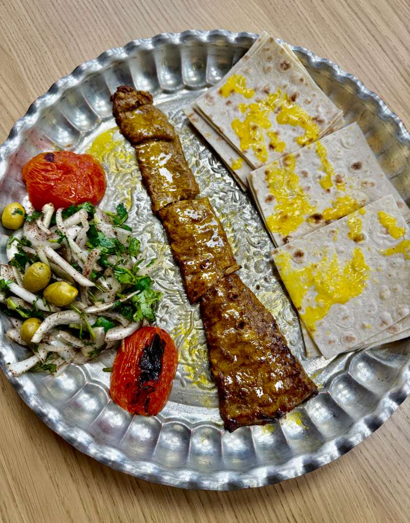 One Skewer Of Chicken Breast , One Skewer Of Ground Beef Kabob ( Koobideh) Served With Lavash Bread & Grilled Tomato