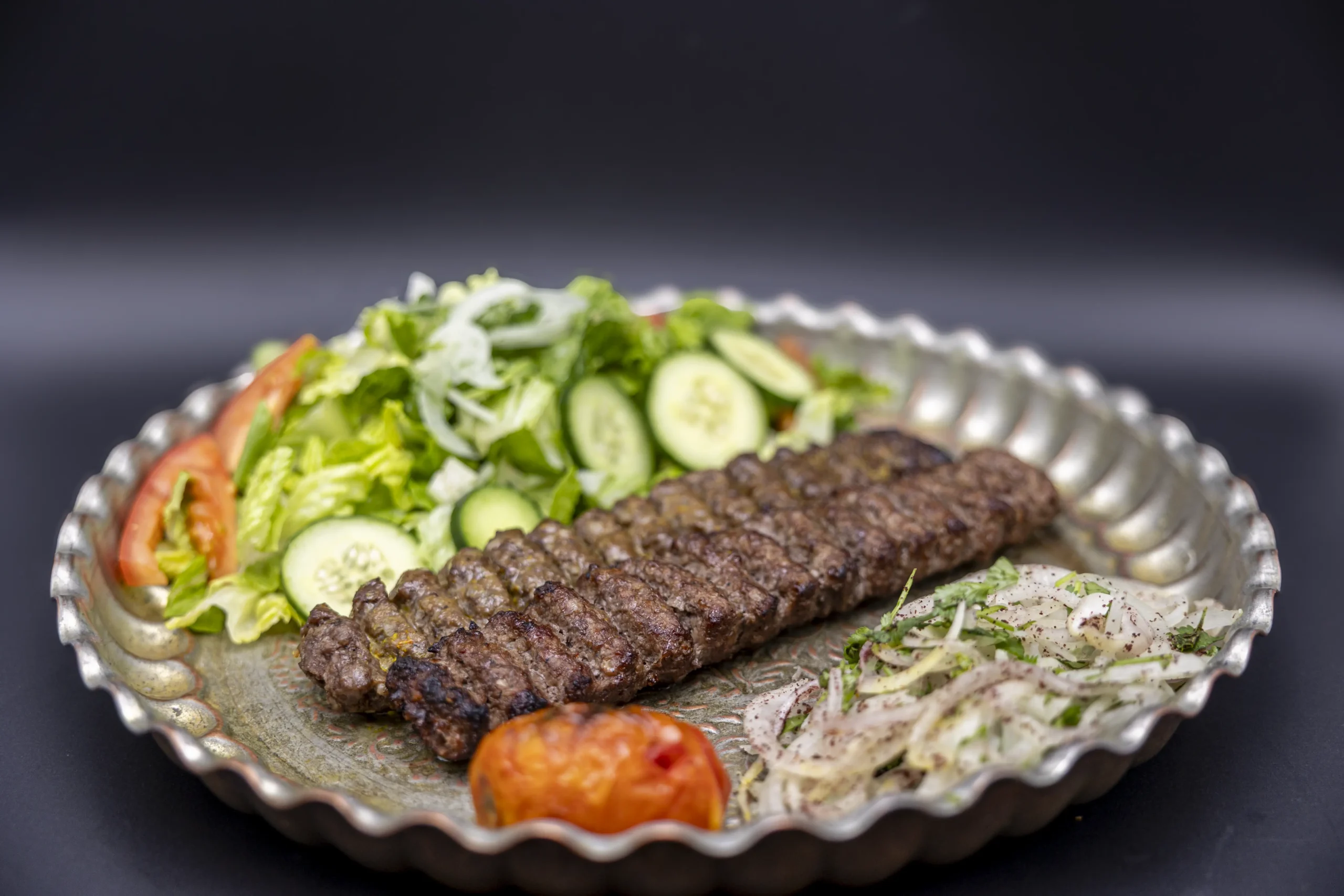 One Skewer Of filet mignon, one skewer of ground beef kabob (Koobideh), served With salad & Grilled Tomato