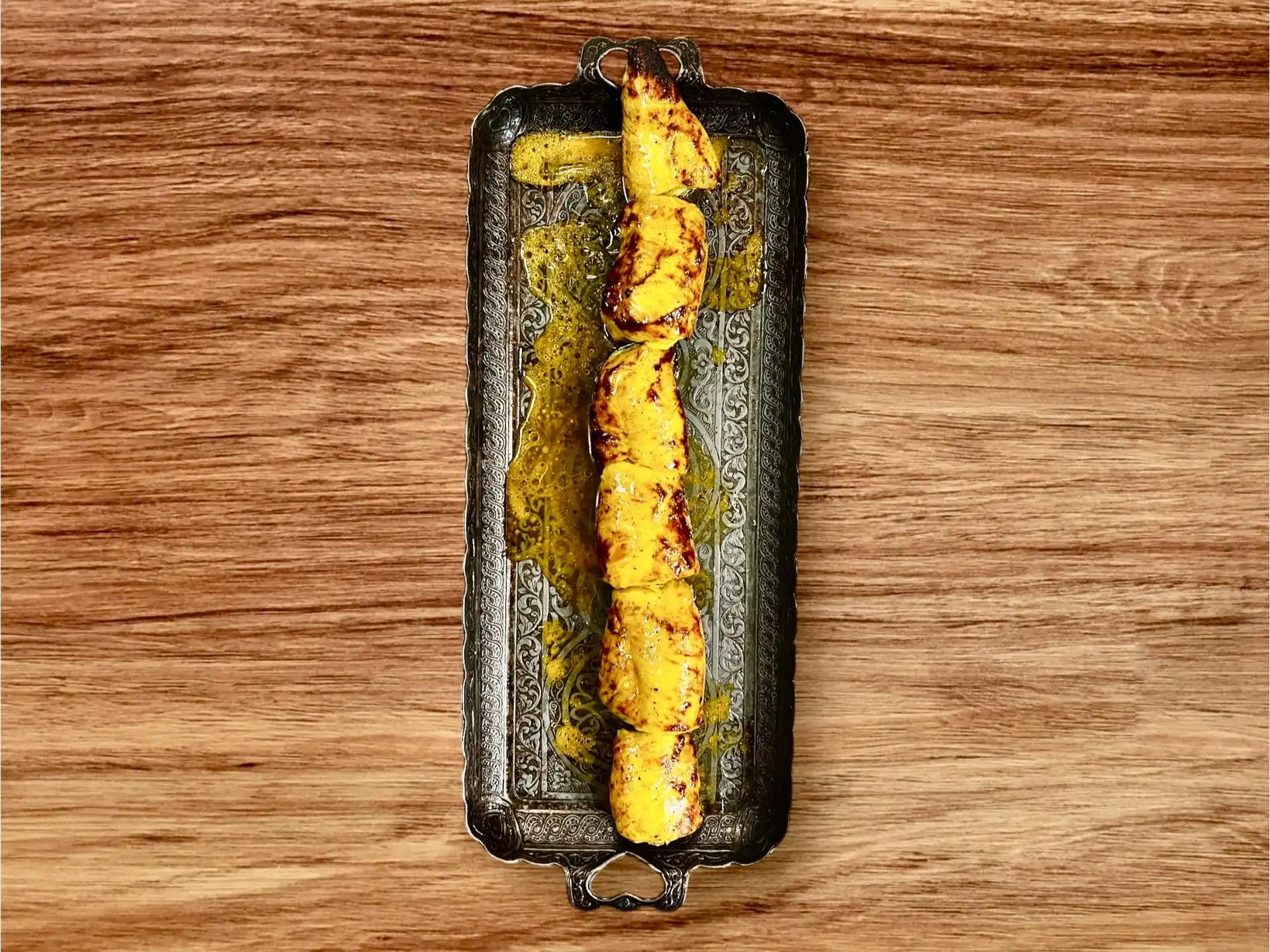 Tender, marinated chicken breast pieces grilled on a skewer with a hint of Mediterranean spices.