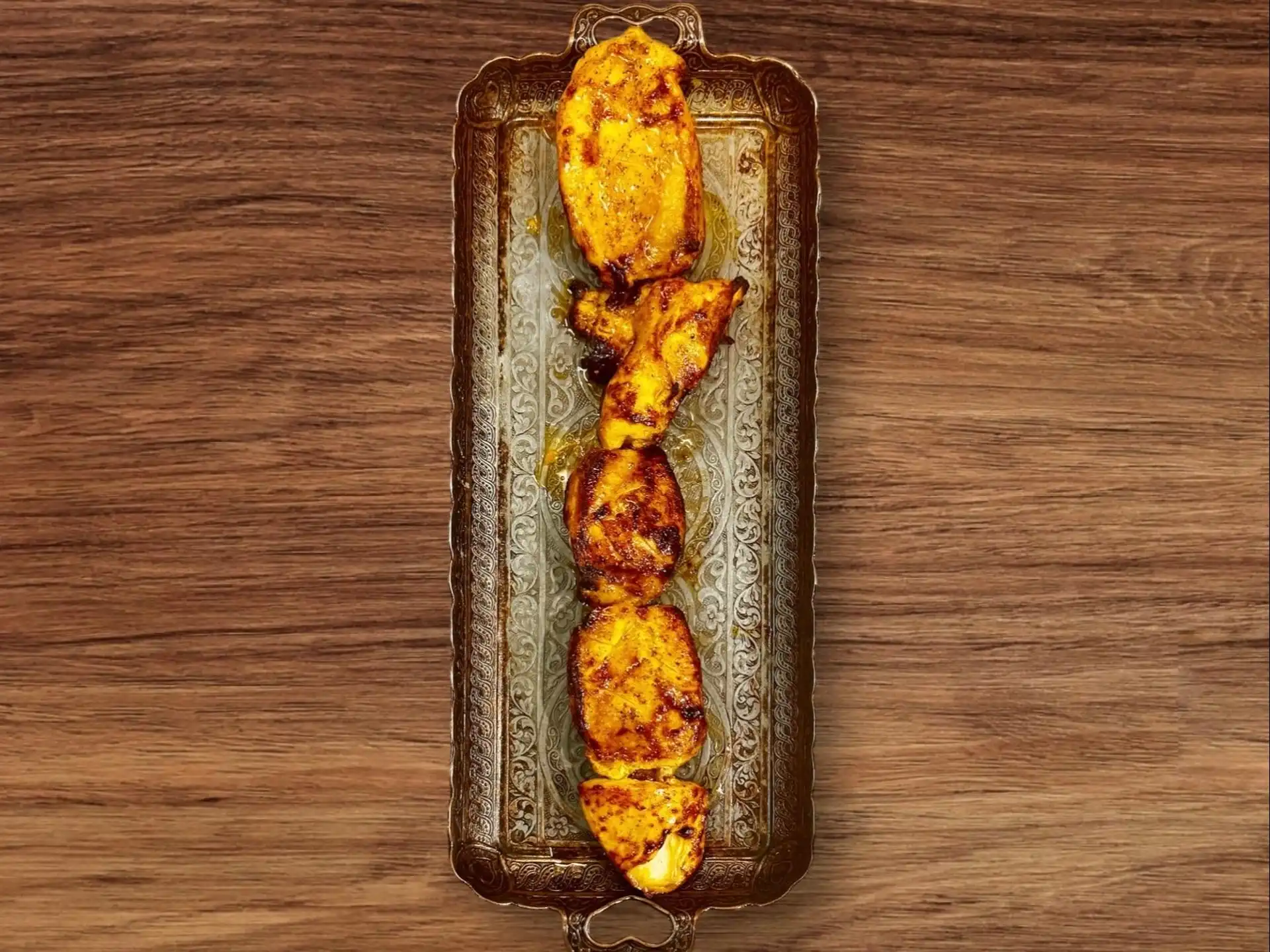 Tender, marinated chicken breast pieces grilled on a skewer with a hint of Mediterranean spices.