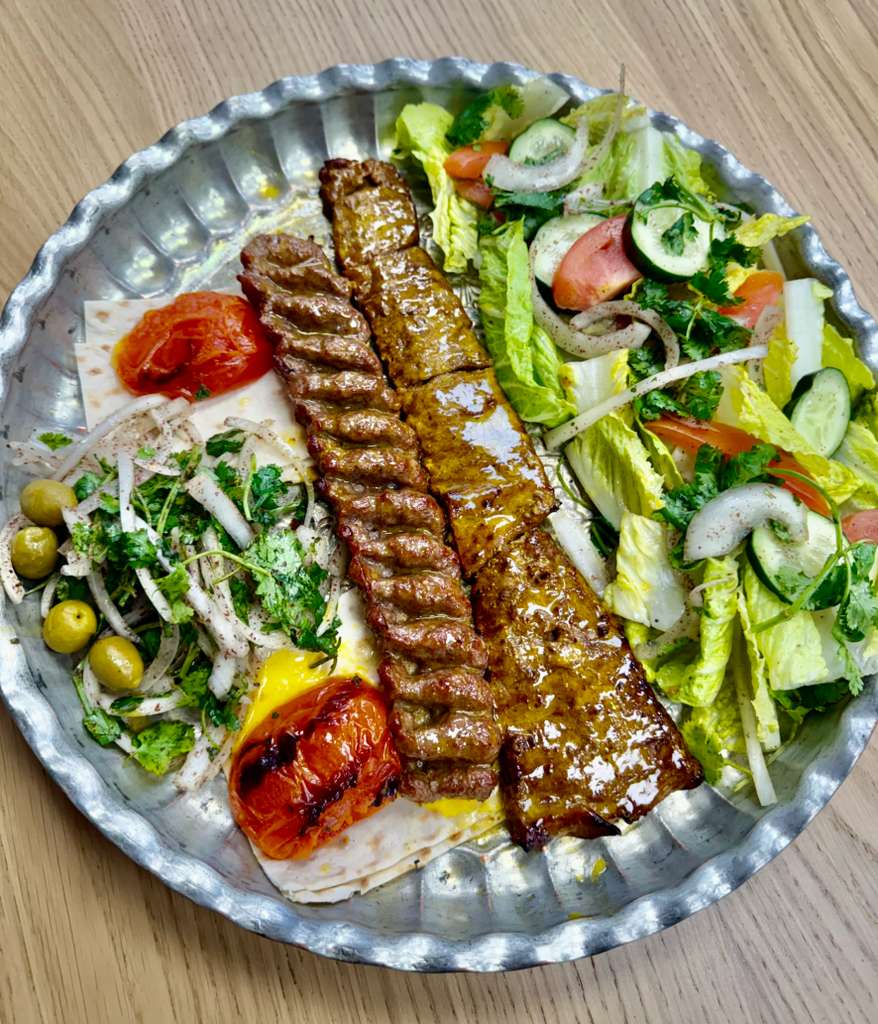 One Skewer Of Chicken Breast , One Skewer Of Ground Beef Kabob (Koobideh) Served With Salad & Grilled Tomato